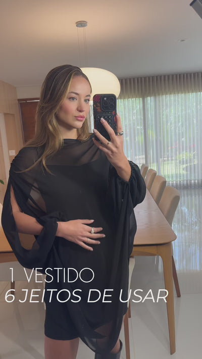 Confeccionado em Musseline Toque de Seda, acompanha faixa removível e um vestido interno com alças reguláveis. Sua modelagem inovadora permite diversas formas de uso — do casual ao sofisticado, da cidade a praia — adaptando-se ao seu estilo e ocasião. Assista ao vídeo demonstrativo e descubra todas as possibilidades dessa peça única.